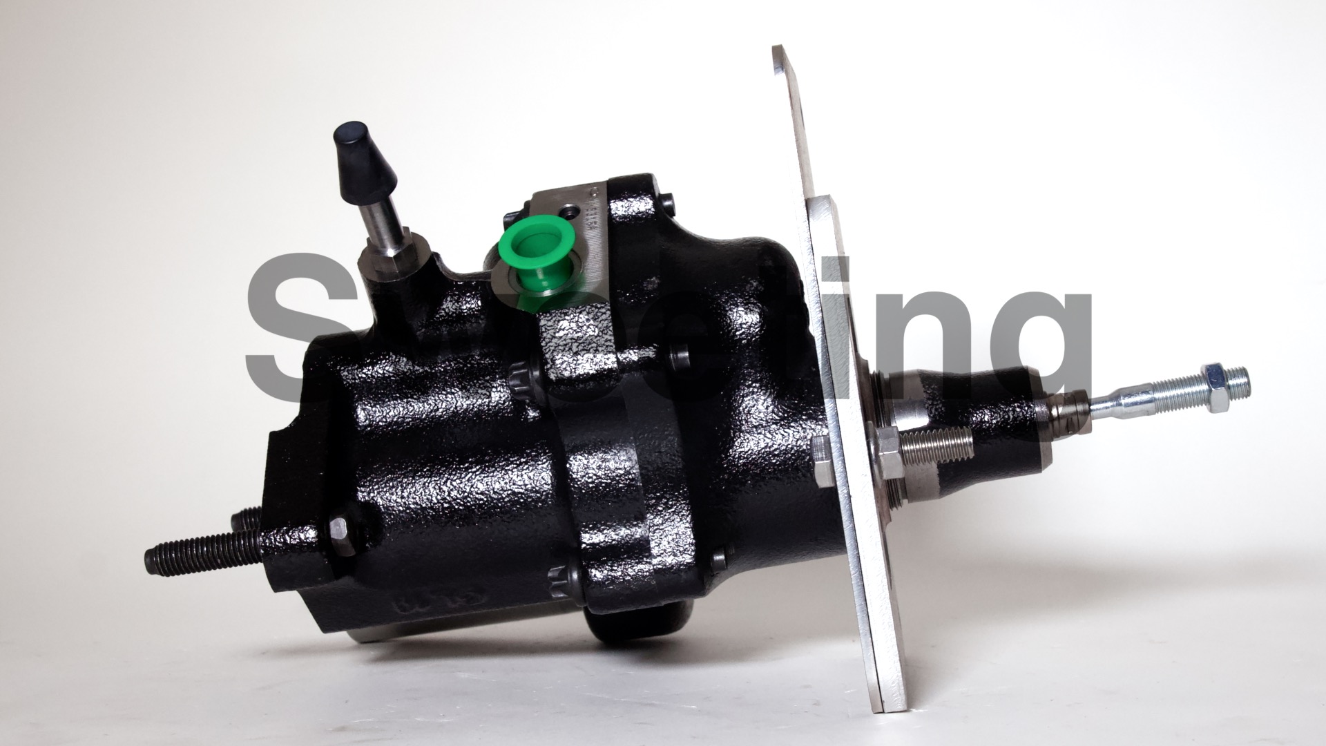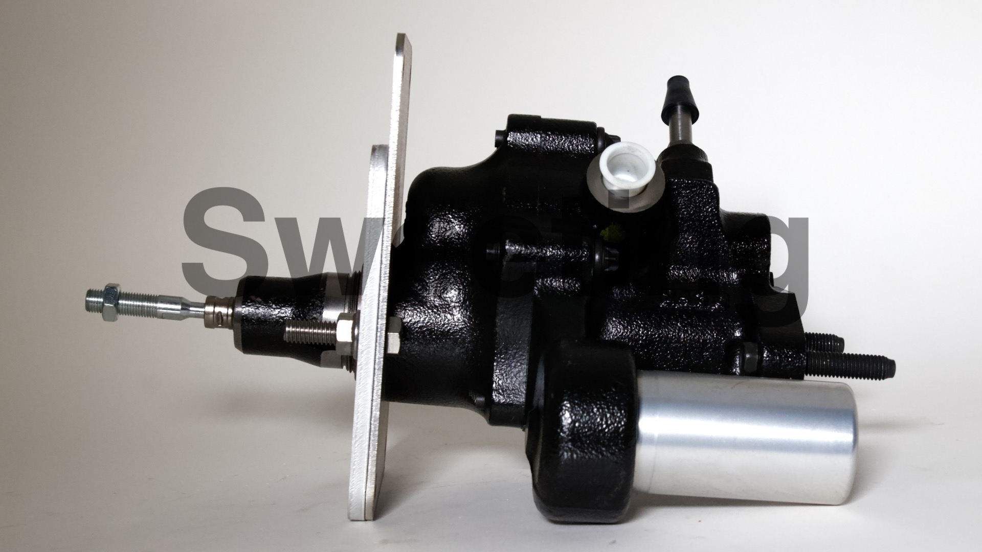 The Hydro-Boost is smaller in diameter than vacuum boosters, being about the dimensions of an iron master cylinder, it mates to the firewall/brake pedal and the master cylinder the same way a vacuum booster does, and it fits anywhere a vacuum booster will, as well as many place a vacuum booster won't. The aluminum canister on the side is the accumulator, which stores pressure in case your engine dies to provide you with some braking and steering assist to help you come to a safe stop.