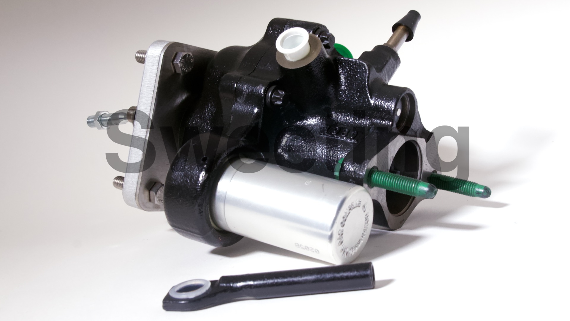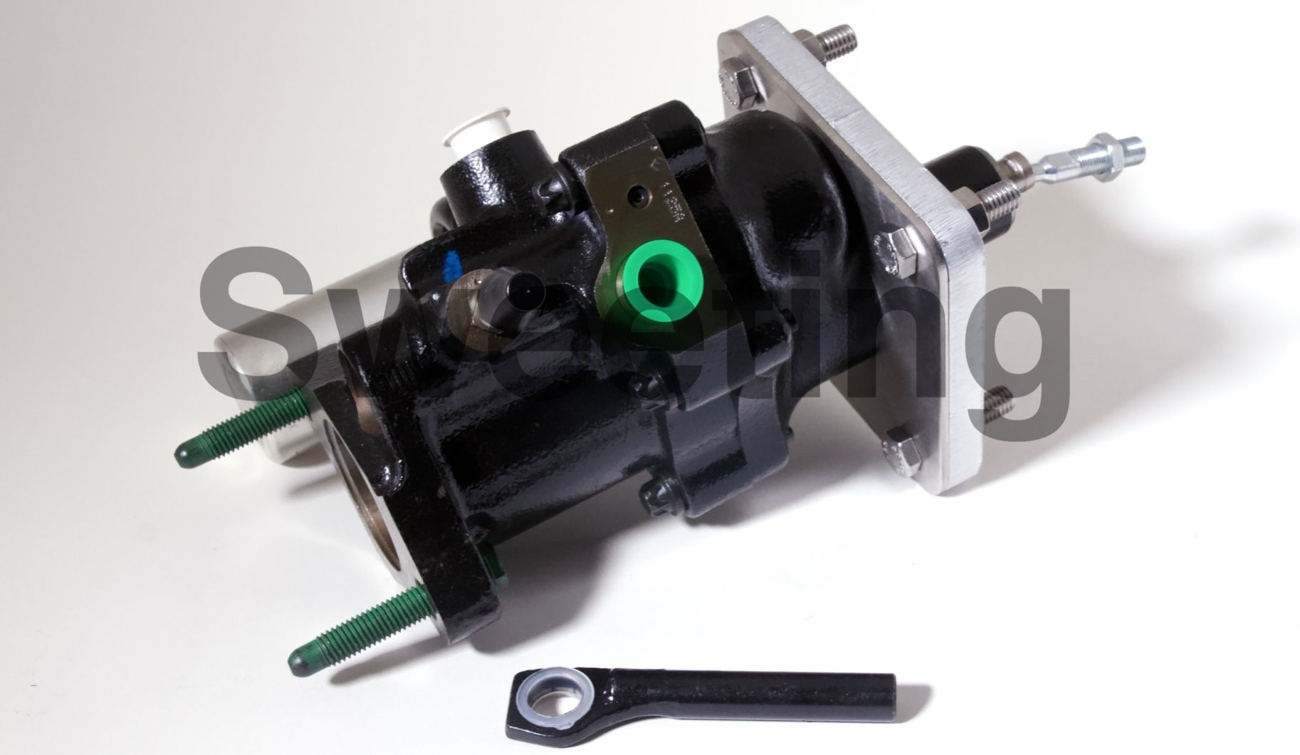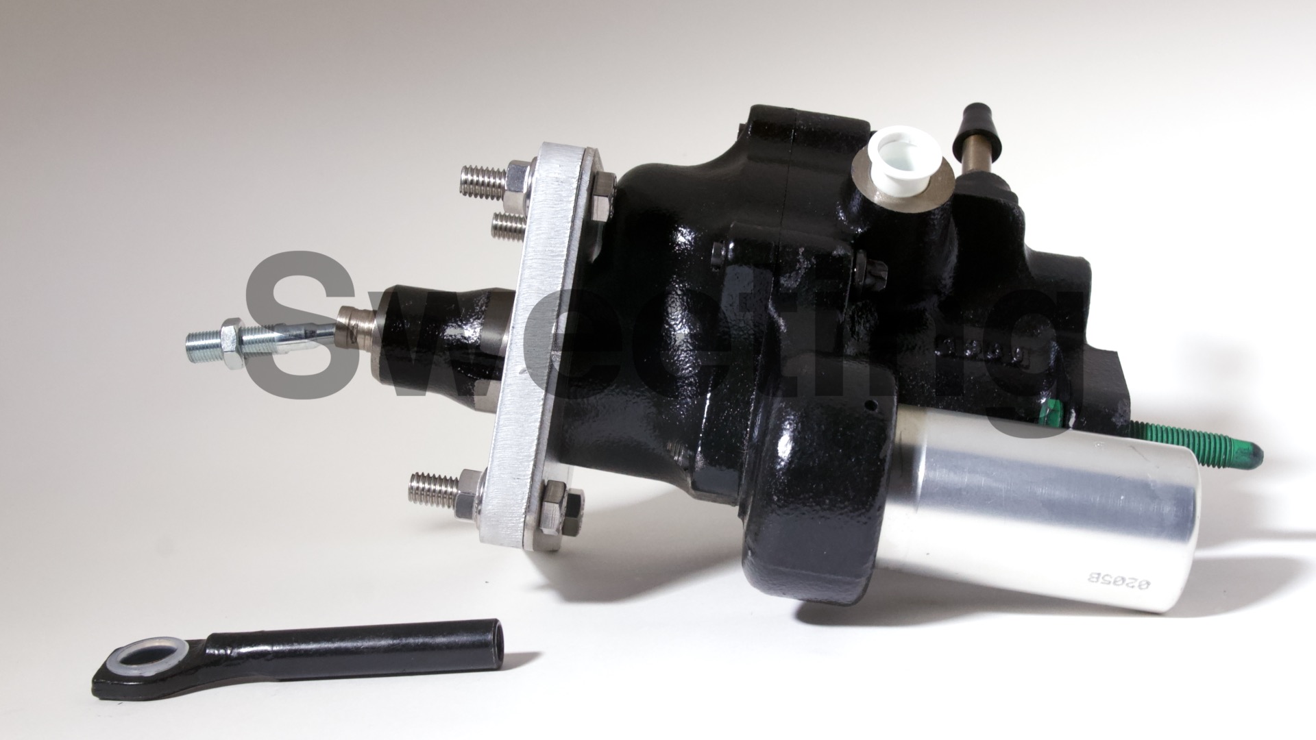 The Hydro-Boost is smaller in diameter than vacuum boosters, being about the dimensions of an iron master cylinder, it mates to the firewall/brake pedal and the master cylinder the same way a vacuum booster does, and it fits anywhere a vacuum booster will, as well as many place a vacuum booster won't. The aluminum canister on the side is the accumulator, which stores pressure in case your engine dies to provide you with some braking and steering assist to help you come to a safe stop.