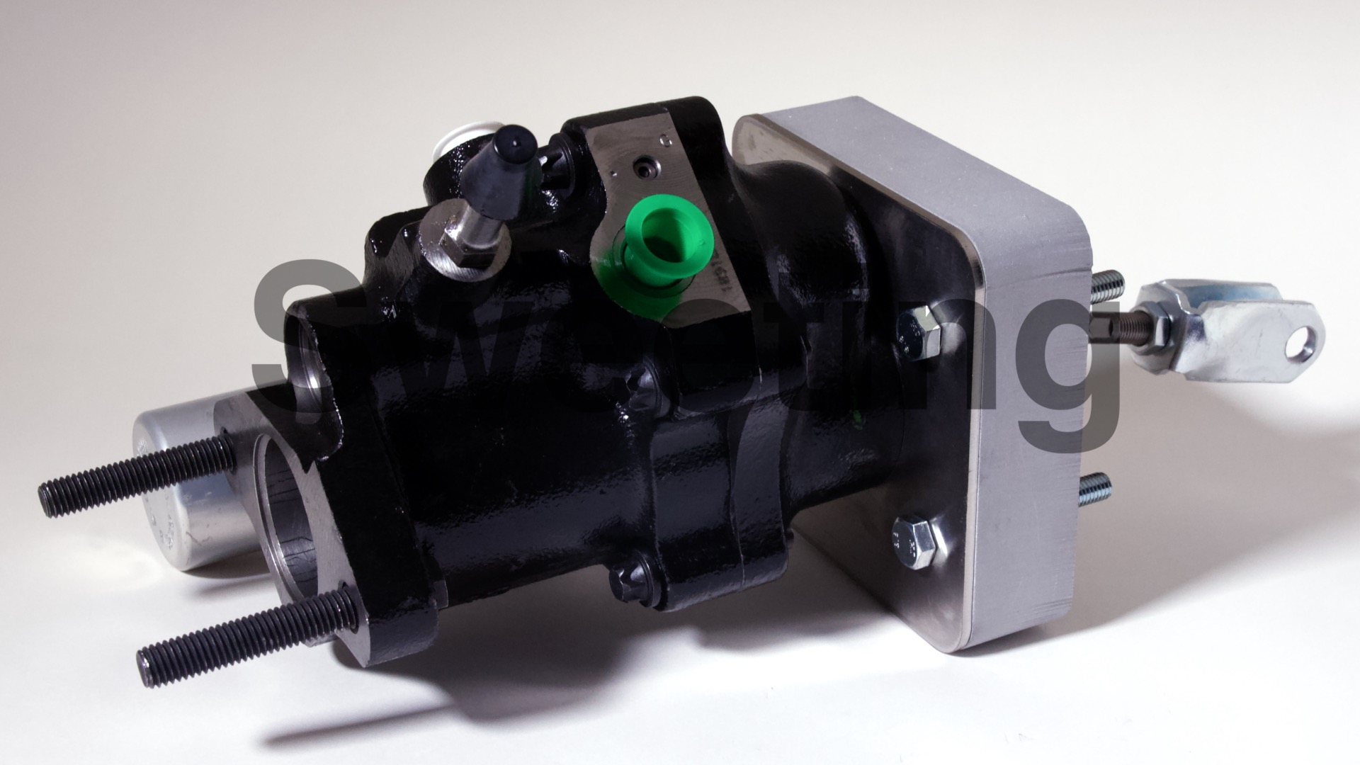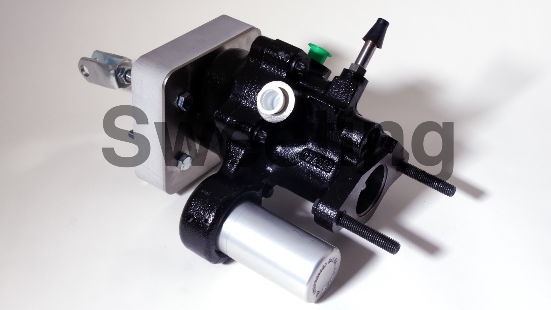The Hydro-Boost is smaller in diameter than vacuum boosters, being about the dimensions of an iron master cylinder, it mates to the firewall/brake pedal and the master cylinder the same way a vacuum booster does, and it fits anywhere a vacuum booster will, as well as many place a vacuum booster won't. The aluminum canister on the side is the accumulator, which stores pressure in case your engine dies to provide you with some braking and steering assist to help you come to a safe stop.